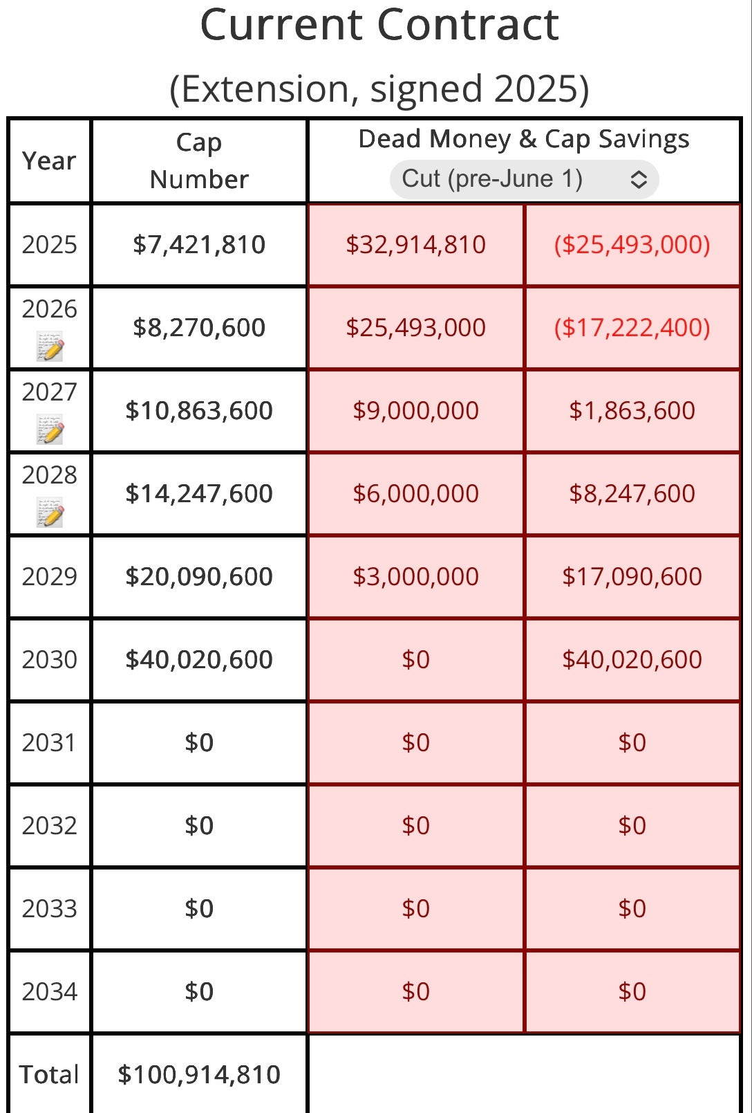 The fully guaranteed parts are the signing bonus, the 2025 base salary, and the 2026 compensation. New guarantees beyond next year won’t kick in until the third league day next March, when $16 million of the 2027 compensation becomes fully guaranteed.”
