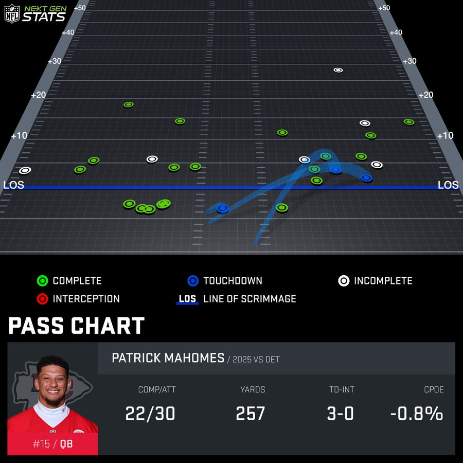 That’s 151 of Patrick Mahomes’ 257 yards on Sunday Night. The Chiefs attacked over the middle or built off of short throws and solid blocking for those short throws. The Chiefs didn’t really have any explosive plays in this game. Actually, they had just one play where Mahomes threw from 20-plus air yards, and that was in the first quarter. Everything else was short. Take a look at Mahomes’ chart.