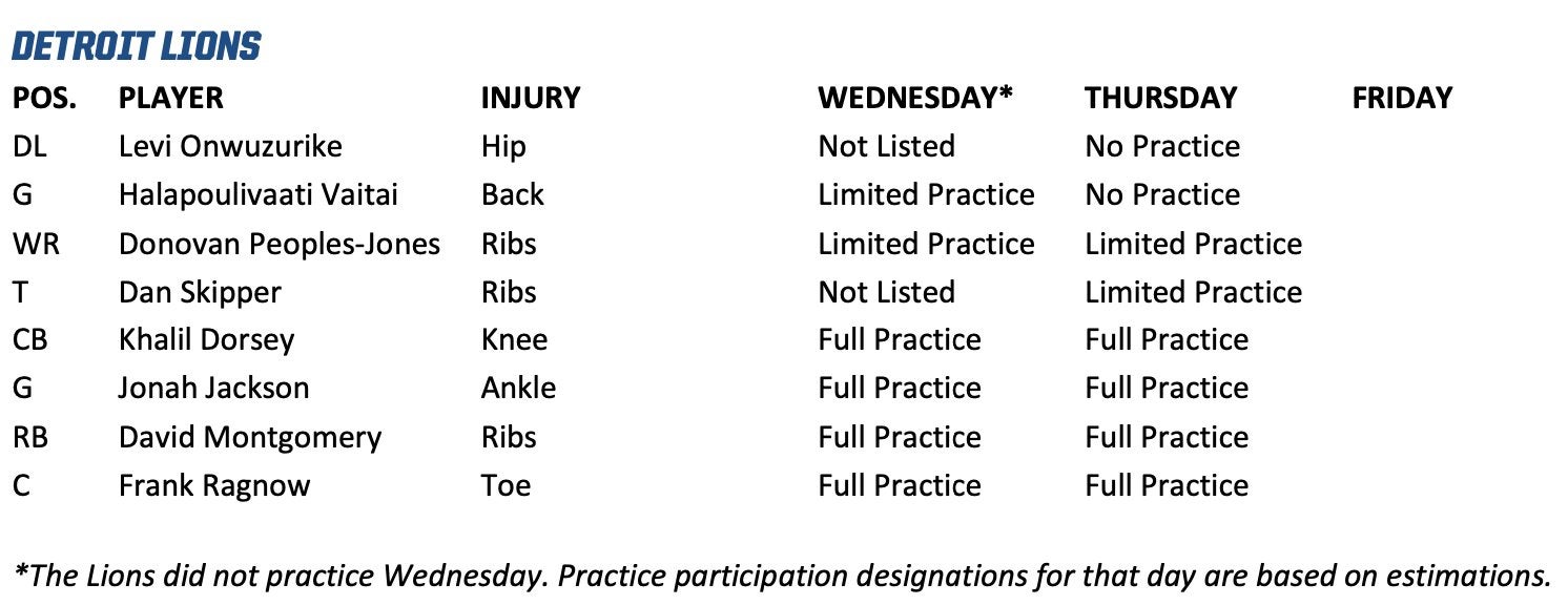 Levi Onzwuzurike and Halapoulivaati Vaitai did not practice Thursday. Vaitai seems to still be having issues with his back. Donovan Peoples-Jones and Dan Skipper were limited. I would imagine there's a chance that Peoples-Jones sits out this first game while he lets that rib injury heal and, more importantly, learns the playbook.