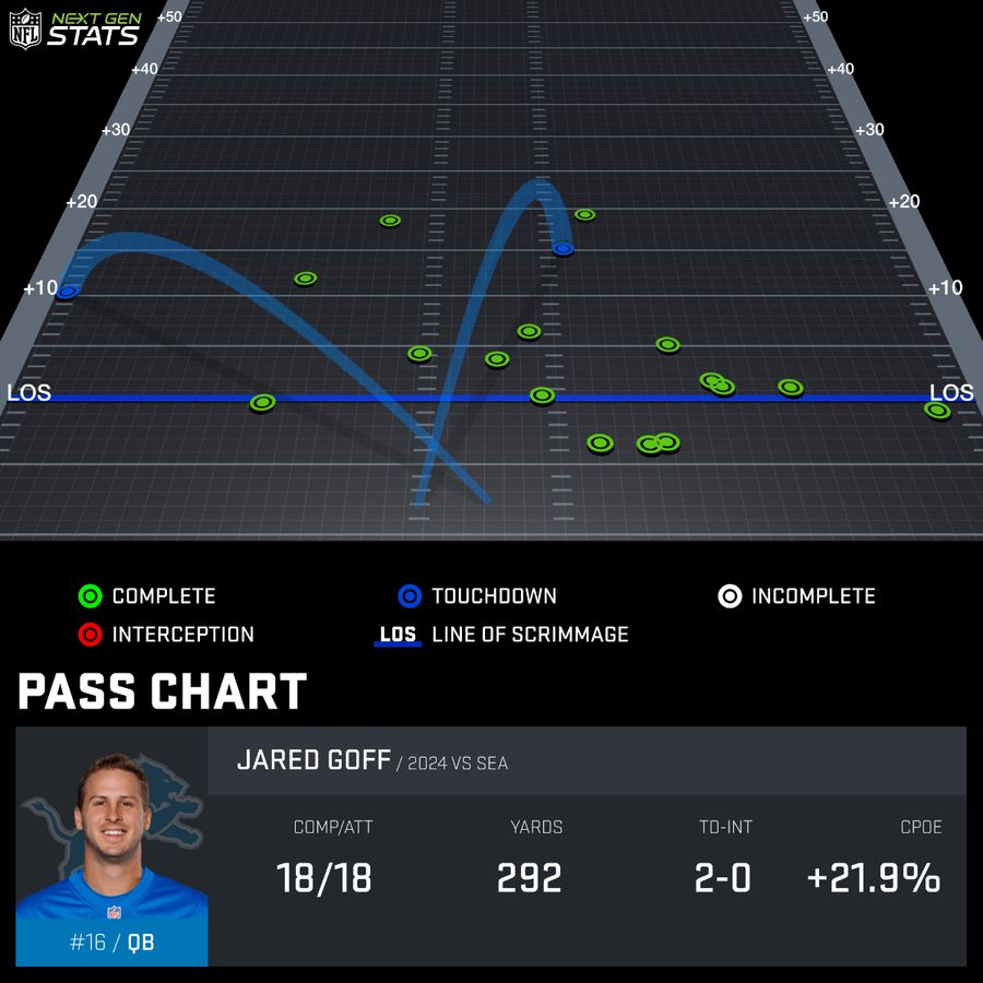 The Detroit Lions got a big 42-29 win over the Seattle Seahawks on Monday night and the highlight of the night was Jared Goff throwing a perfect complete game. The only one in NFL history. He went 18-18 for 225 yards, two passing touchdowns and a receiving touchdown. What a night.