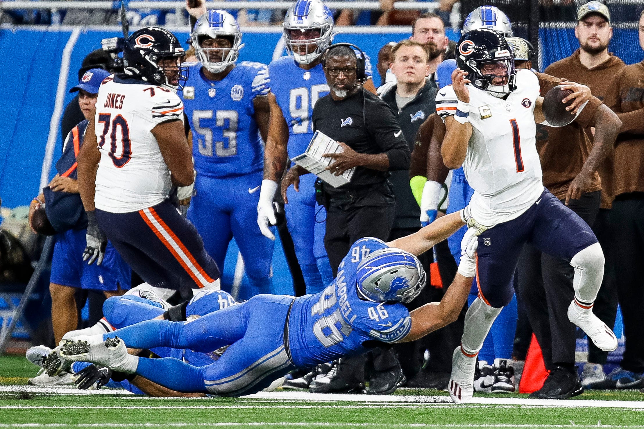 The prediction I had was that Campbell could help stop Justin Fields from using his feet. That didn't happen. Fields ran for 104 yards on Sunday and you can see in the above picture that Campbell wasn't able to stop him.