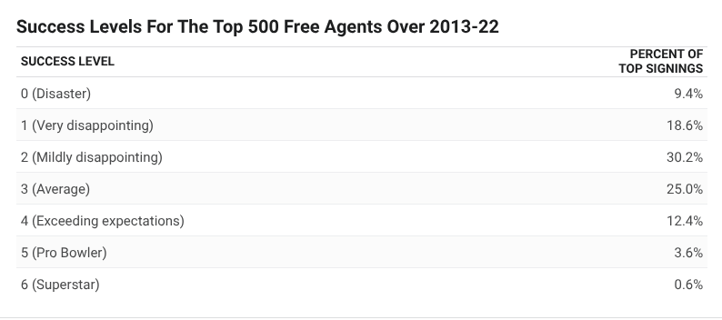As you can see, the hope for free agents to really go out and become something special is the hope of a fool. What you’re really hoping for is average or exceeding expectations. Those are some decent success rates. You’re probably not getting a Pro Bowler. You’re almost definitely not getting a superstar.