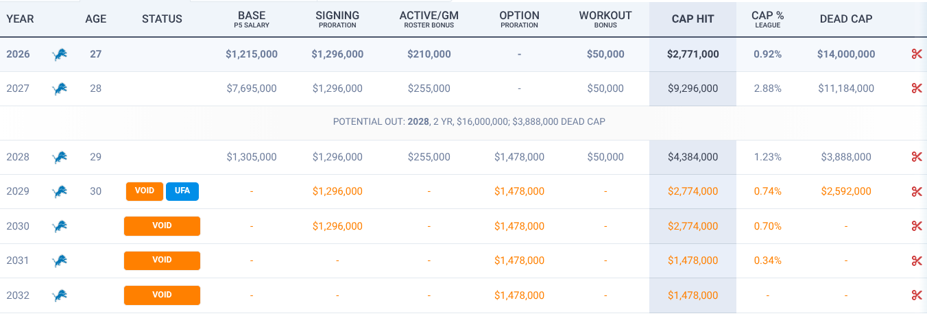 And I mean really soon. If Mays goes out and has a killer season in 2026, the Lions could look to extend immediately and they already have these void years in place to make it happen. It would allow them to take the 2027 cap hit, which is the highest cap hit on the deal, and spread it out and make some of those void years actual contract years.