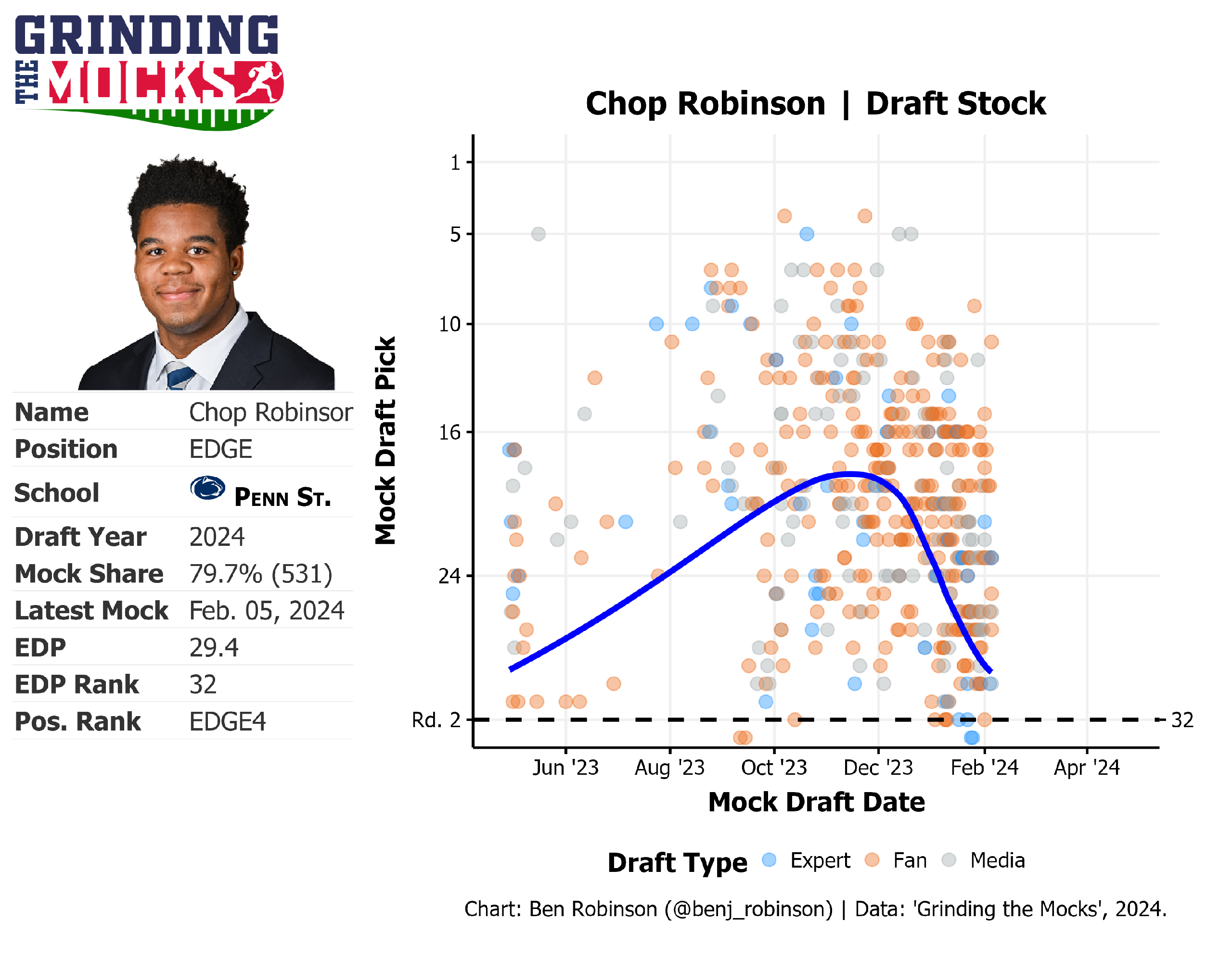 Penn State edge Chop Robinson seems to find his way to the Lions a lot. He's been featured in 531 mock drafts so far and his expected draft position per the model is 29.4. It's worth noting that Robinson is on a bit of downslide right now.