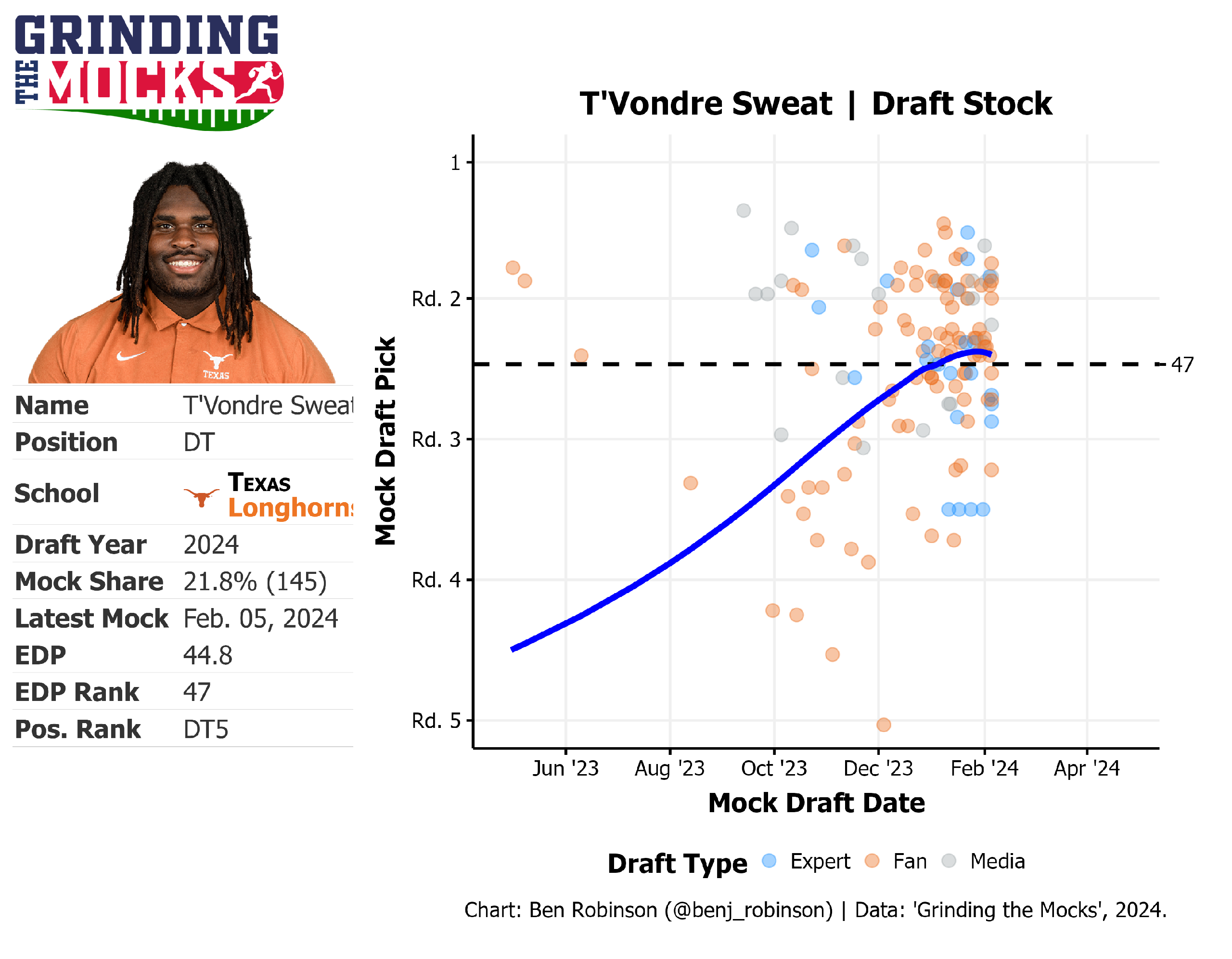 It's a fun tool and I recommend taking a look at it if you're a draft nerd. The charts give you a really good idea of who is rising and falling on the draft boards. You can see Robinson is falling, but look at the rise that T'Vondre Sweat is on.