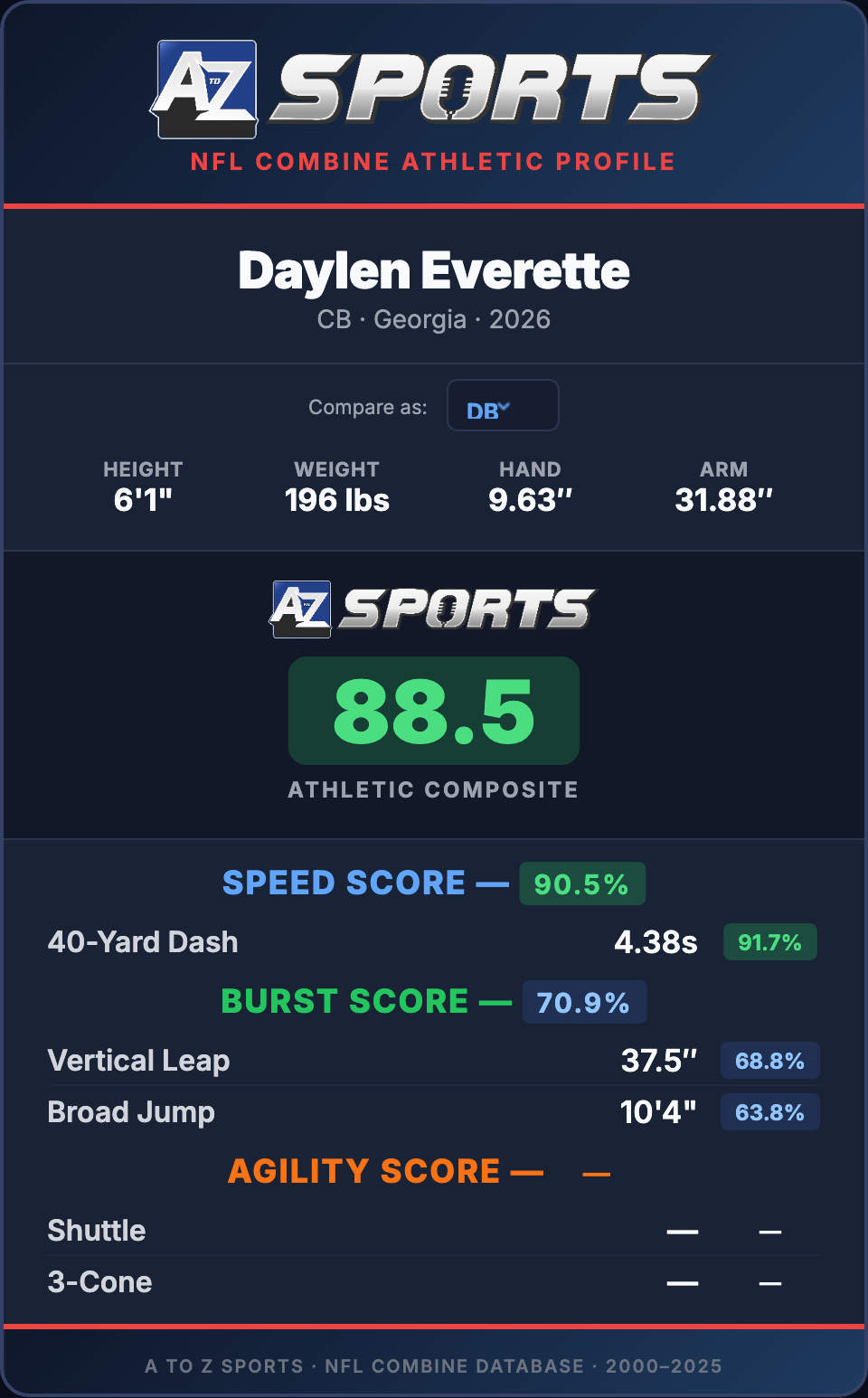 Everette ran a 4.38-second forty-yard dash (92nd percentile). Then he posted a Burst Score above the 70th percentile to go along with that. Everette has the length, prototypical build, speed, burst, and twitch to be an early-round cornerback. NFL teams likely took notice. He was already a fringe Day Two pick. This kind of performance typically locks in Top 100 capital for corners.