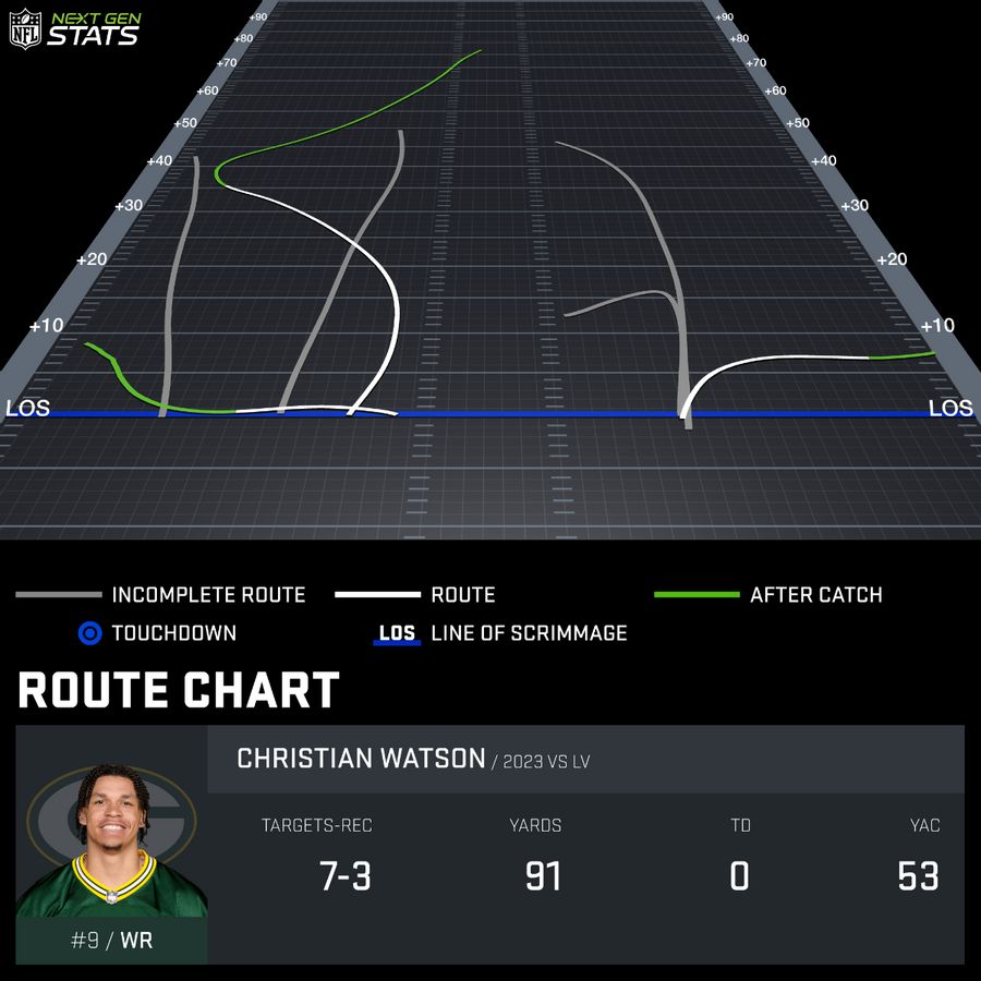 Looking at Christian Watson's route tree in Las Vegas, it's pretty clear how the Packers coaching staff sees him — at least in the moment. There's no nuance to his routes, just a fast player running on a straight line.