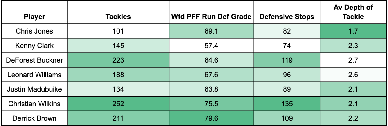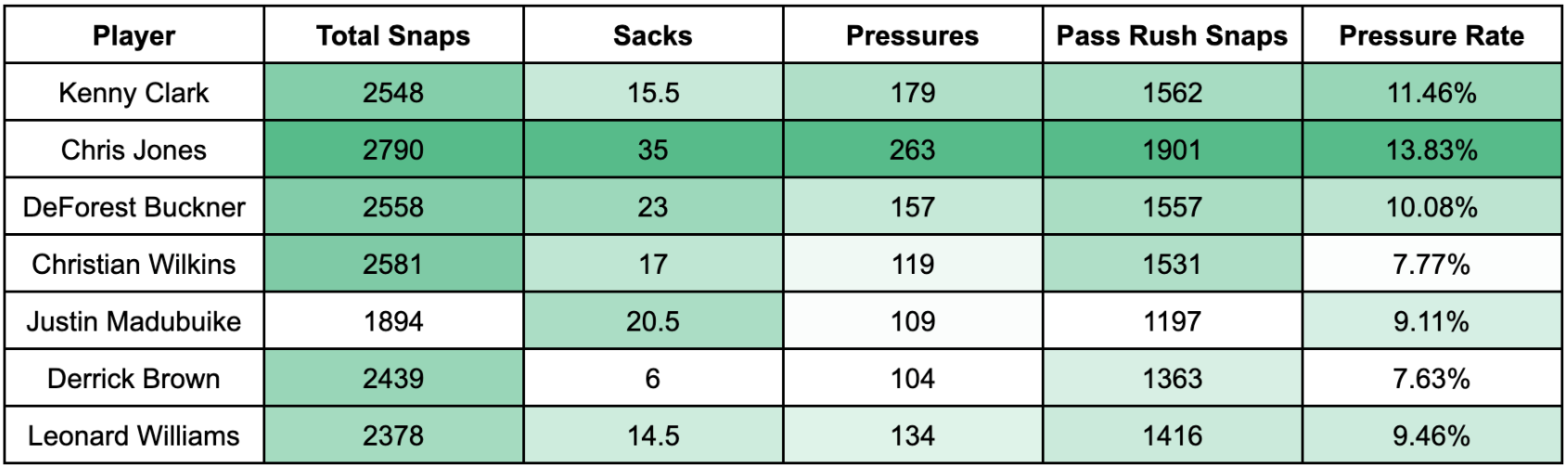 Within this group Clark ranks fifth in sacks, second in total pressures and second in pressure rate. Now, as a run defender, Clark leaves more to be desired.