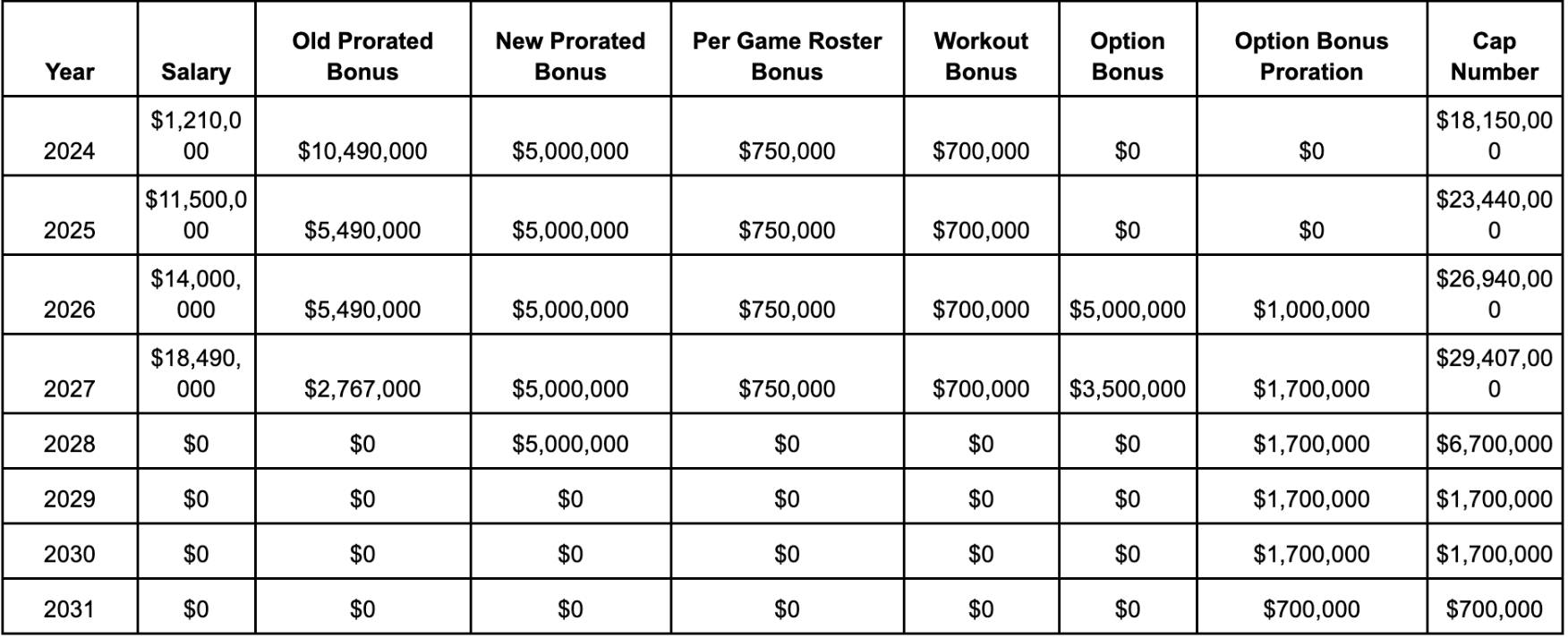 The Packers typically do not fully guarantee any portion of a contract outside of a player’s signing bonus, which is usually a bit over ⅓ of the total contract. The contract (including the final year of his current deal could look similar to this: