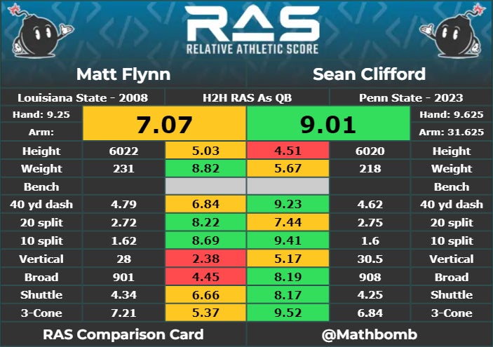 The comparison between Flynn and Clifford is not only an individual perception for Clements. Going through their draft profiles on NFL.com, you can see the parallels — with a significant college experience difference, since Flynn was mostly a backup at LSU, while Clifford started 46 games at Penn State. On the other hand, Clifford is even more athletic.
