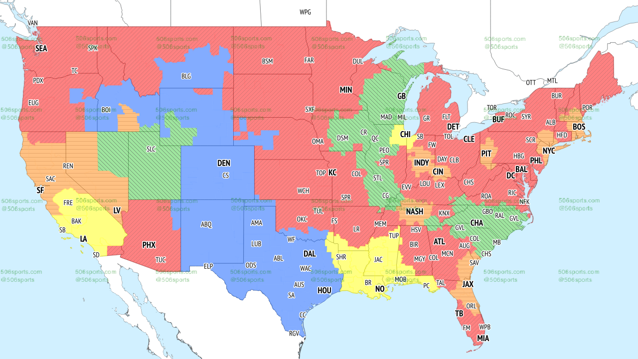 Fox will have only one broadcast map window this Sunday, even though there are three games in the early window and two in the late one. The Packers play the Panthers in the first window (green). The other games are Minnesota Vikings at Detroit Lions (red) and Denver Broncos at Houston Texans (blue). The second window has the New Orleans Saints at Los Angeles Rams (yellow) and Jacksonville Jaguars at Las Vegas Raiders (orange).