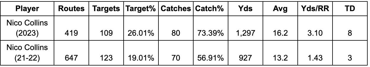 Despite the impressive 2023 season, Houston will likely push back that Collins isn’t a true #1 receiver as evidenced by the fact that his volume of routes trails all of those other receivers. Additionally, the team just traded for Stefon Diggs showing a lack of faith that Collins may be a true primary receiver.