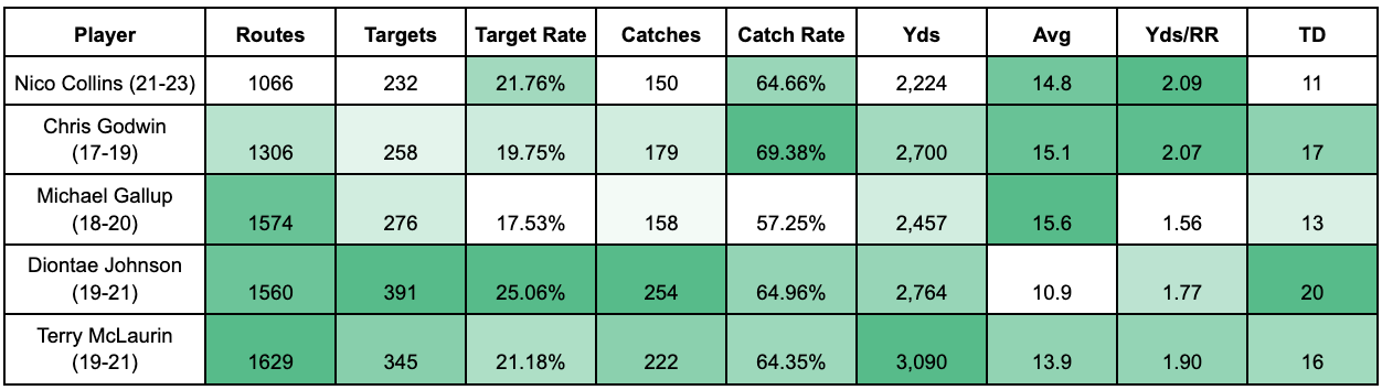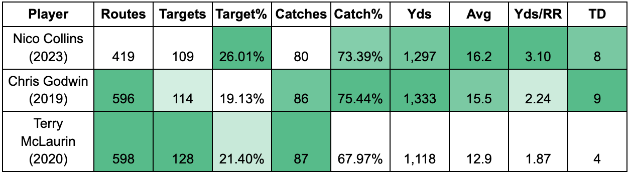 Collins rates poorly compared to the rest in volume stats, but favorably on the more stable efficiency metrics (yds/rr, yds/rec, catch rate, target rate). In order for him to secure a deal of $20 million or more like Godwin and McLaurin he will have to sell the Texans that he is ascending to their level or higher. He can make this case by comparing his 2023 campaign to the other two receivers’ top seasons from their first three years.