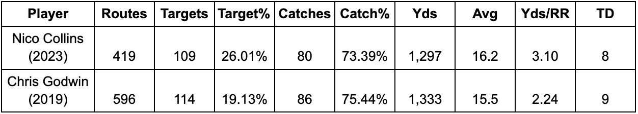 Despite Collins getting less routes the two had almost an identical number of targets due to a much higher target rate. Godwin had a slightly higher catch rate leading to six more catches. But Collins had a vastly superior efficiency rating (yards/route run).