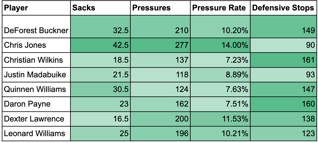 Buckner ranks 2nd or 3rd in every category. What’s interesting is the similarities between Buckner and Leonard WIlliams. The two are close in total pressures and almost identical in pressure rate. But Buckner outpaces Leonard in sacks and defensive stops. Williams just re-signed with the Seahawks for three years and $64.5 million with almost $44 million fully guaranteed and an APY of $21.5 million. With Williams just a few months younger than Buckner that contract should serve as the floor for Buckner’s new deal.
