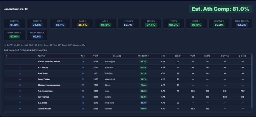 Koziol is known for his pass-catching ability with 237 receptions for 2,234 yards and 24 touchdowns across three seasons at Ball State and one season at Houston. Listed at 6-foot-5 and 257 pounds, he has room to improve as a blocker. Koziol actually compares favorably to former Chiefs tight end Jason Dunn as an athlete, posting a 4.7 40-yard dash, a 36.5-inch vertical, and a 122-inch broad jump at the 2026 NFL Scouting Combine.