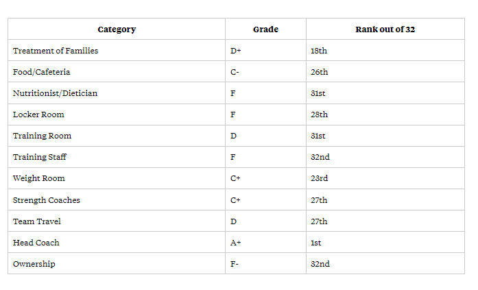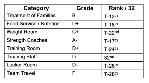 The player's frustration stemmed primarily from workplace offerings such with "D" or "F" marks for things like treatment of families, nutritionist, locker room, training room, and training staff. Ownership and training staff both ranked 32nd in the NFL. One reason ownership was ranked so poorly was that Clark Hunt failed to deliver on promises of an upgraded locker room at the team's practice facilities.