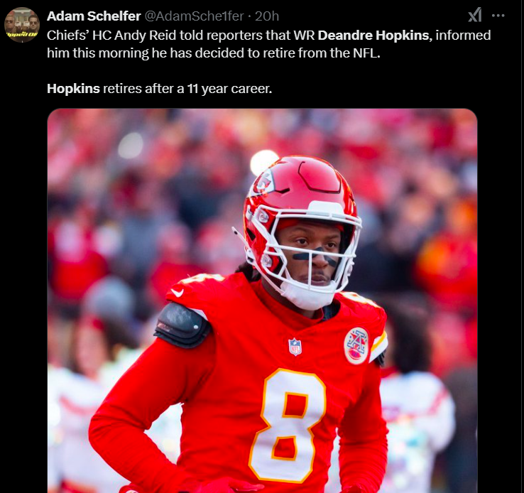 "Chiefs' HC Andy Reid told reporters that WR Deandre Hopkins, informed him this morning he has decided to retire from the NFL.