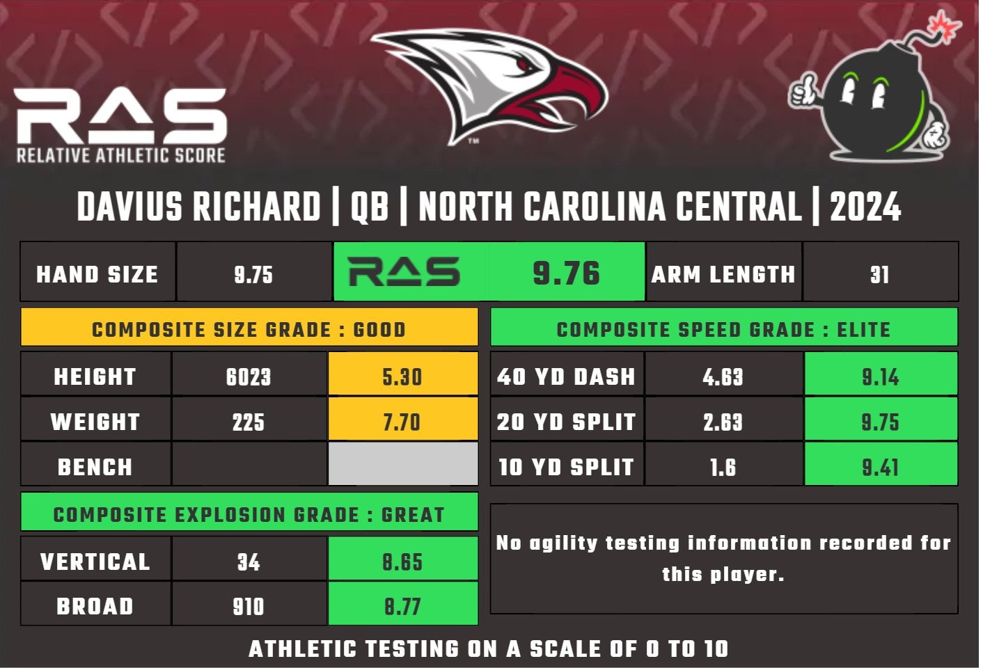 Brett Veach often jokes with Andy Reid about getting a big and athletic backup quarterback to run the QB sneak. They might have found that in Carson Wentz, but Richard would also fit the mold. Listed at 6-foot-2 and 225 pounds, Richard put up some impressive numbers at the HBCU Combine.
