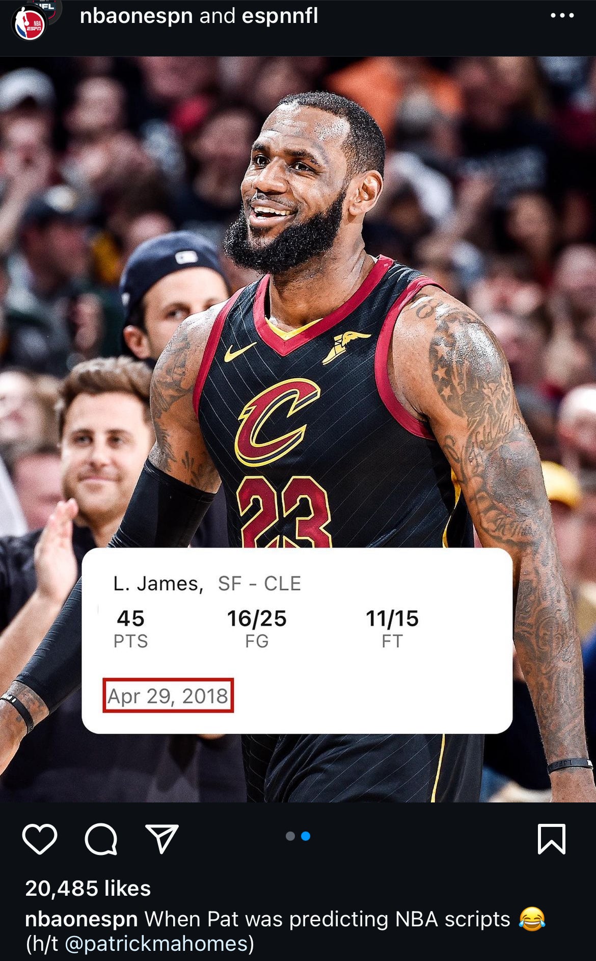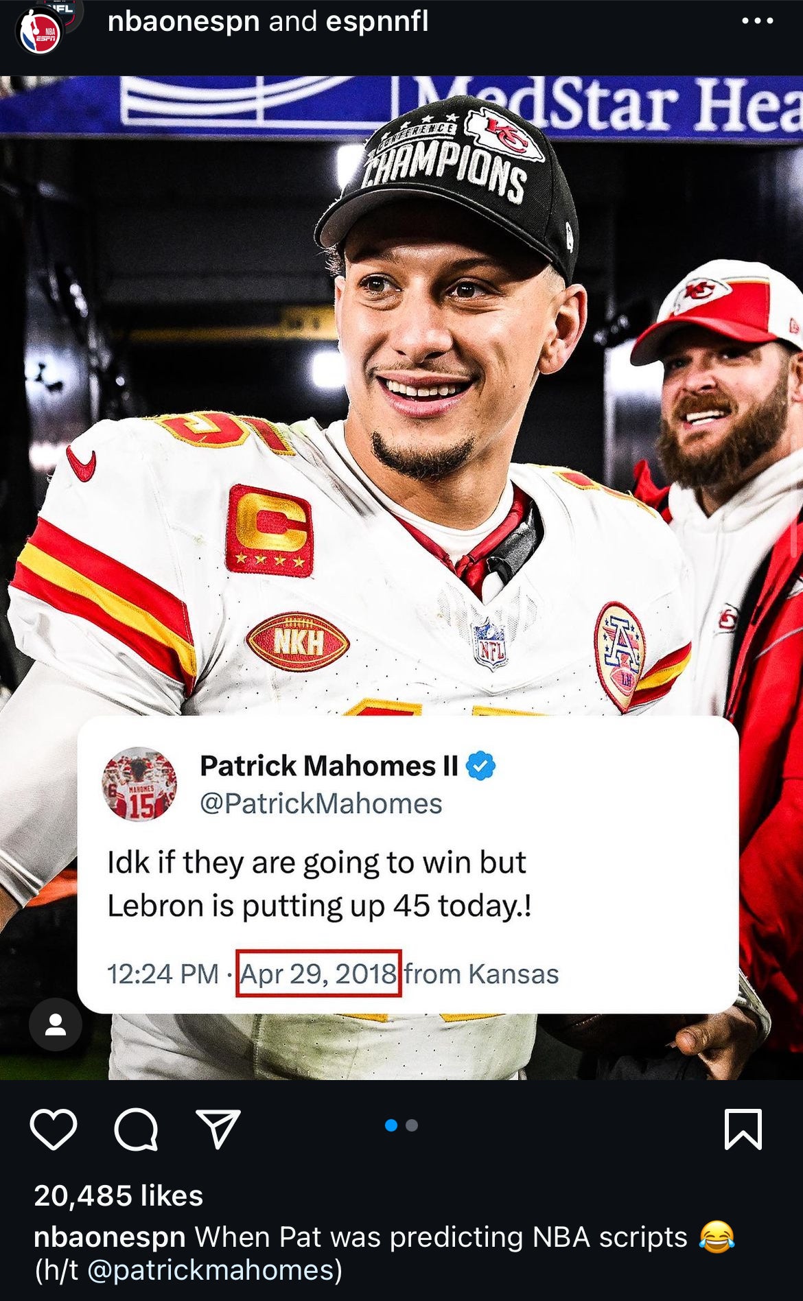 On April 29, 2018, Mahomes tweeted that LeBron James would score 45 points that day.