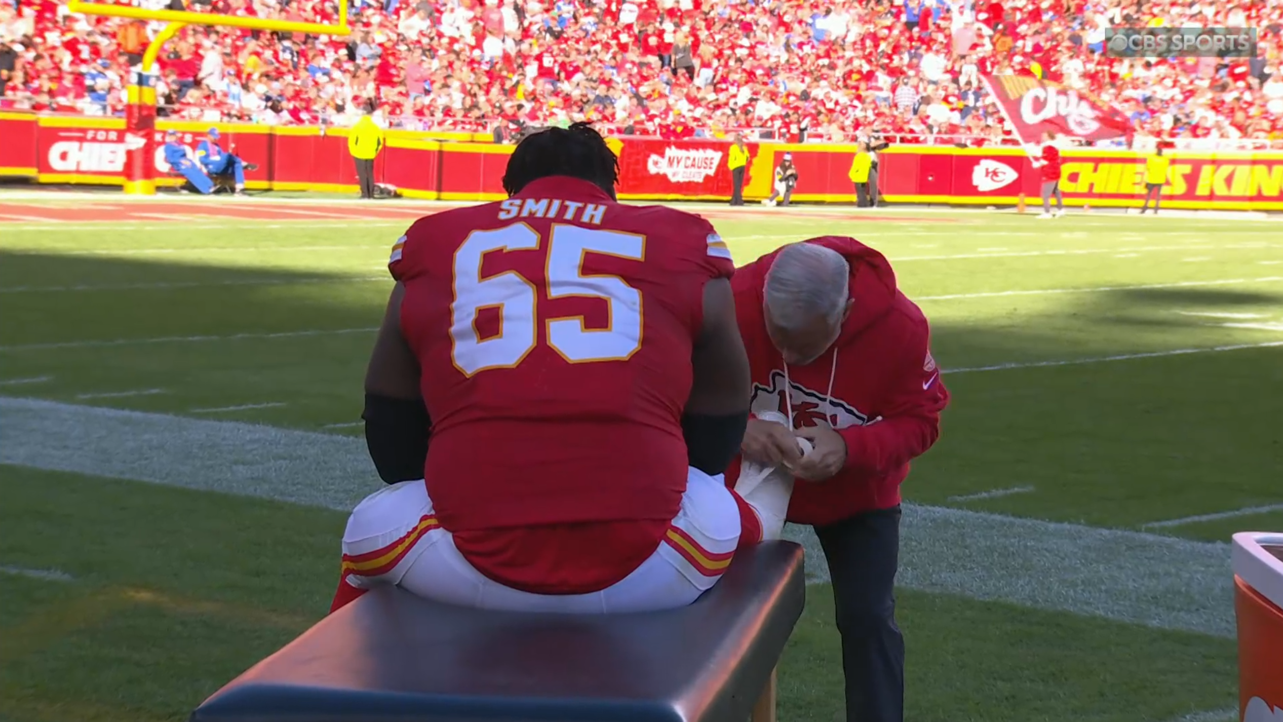 The Chiefs announced that they’ve ruled out starting RG Trey Smith with an ankle injury shortly after the beginning of the third quarter. Smith got up slowly at the end of a play in the second half after being rolled up on from behind while he was making a block.