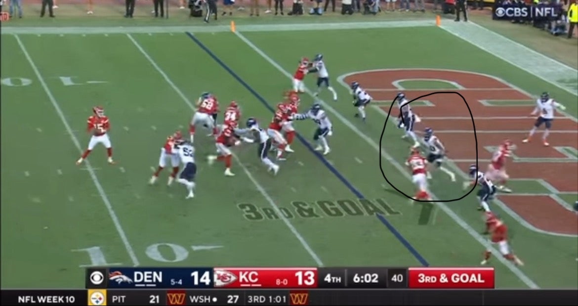 That's a throw that Mahomes will tell you he has to make. But there was a reason why the throw was off. And it was actually because of some poor execution by a Broncos defender.
