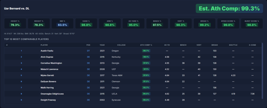 At 6-foot-4.5 and 306 pounds with nearly 36-inch arms, Bernard ran a 4.63s 40-yard dash, a 39-inch vertical (98th percentile), and a 130-inch broad jump (reports on this vary, but it’d be a record for a defensive tackle), and 31 repetitions of 225 on the bench. The guy also has just 6% body fat, which might as well be nothing. While he didn’t run any agility drills, the performance was head-turning enough for NFL clubs.