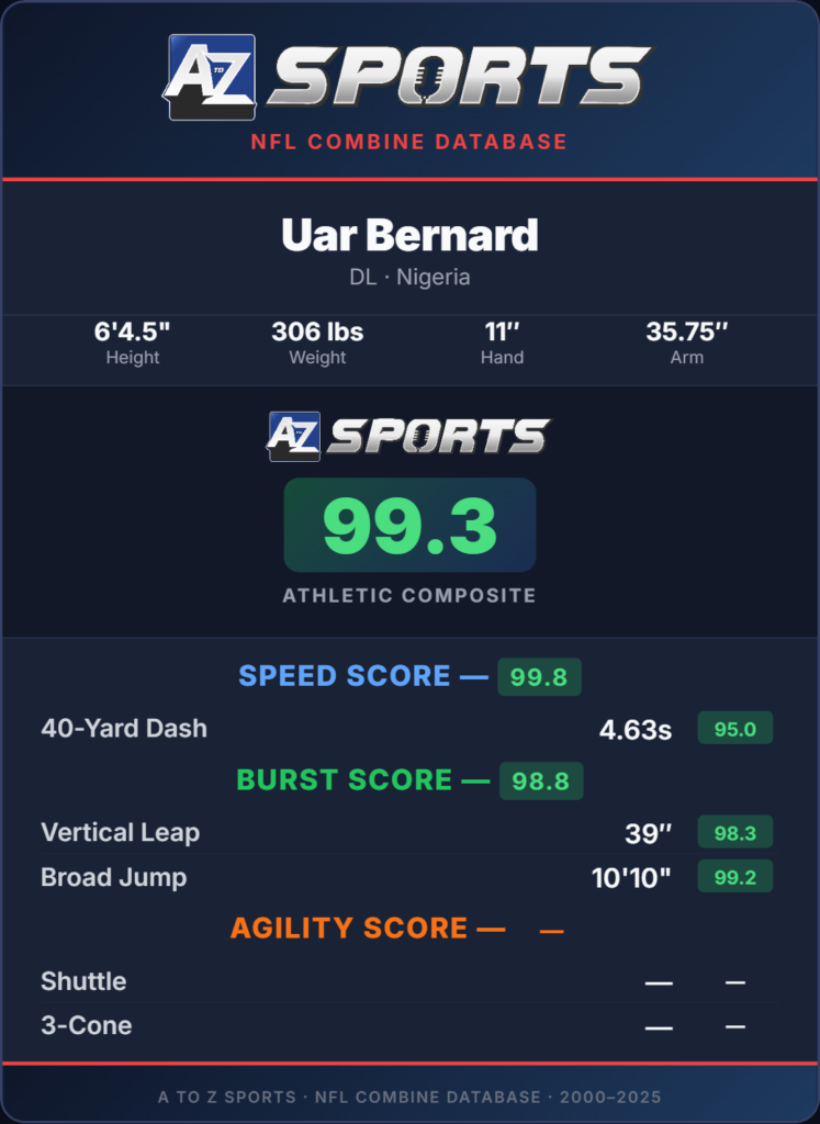 When you plug those numbers into the A to Z Sports NFL Combine Database, which records performances dating back to 2000, Bernard records a staggering 99.3 A to Z Sports Athletic Composite.