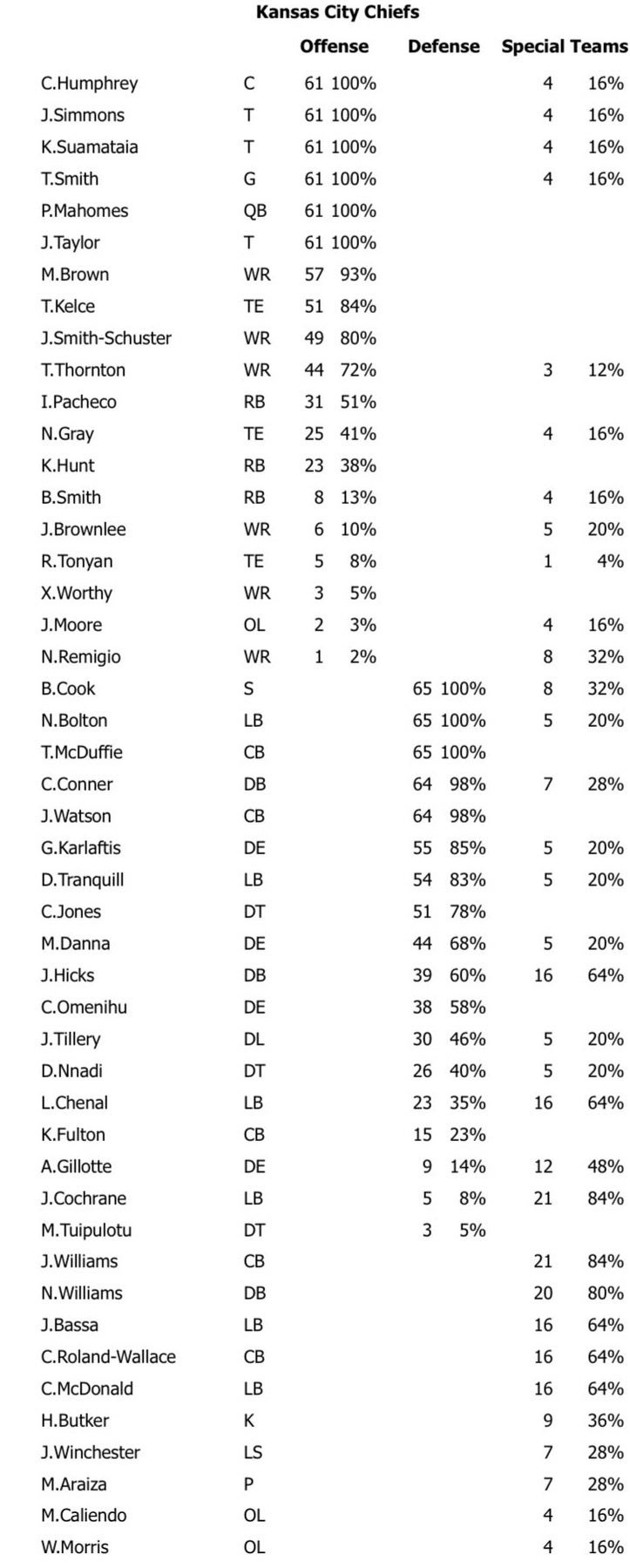 - Marlon Tuipulotu, Josh Williams, Nohl Williams, Jeff Bassa, Chris Roland-Wallace, and Cooper McDonald played only special teams snaps. In the first week of the season, I expected more rotation on defense from the Chiefs to keep guys fresh.