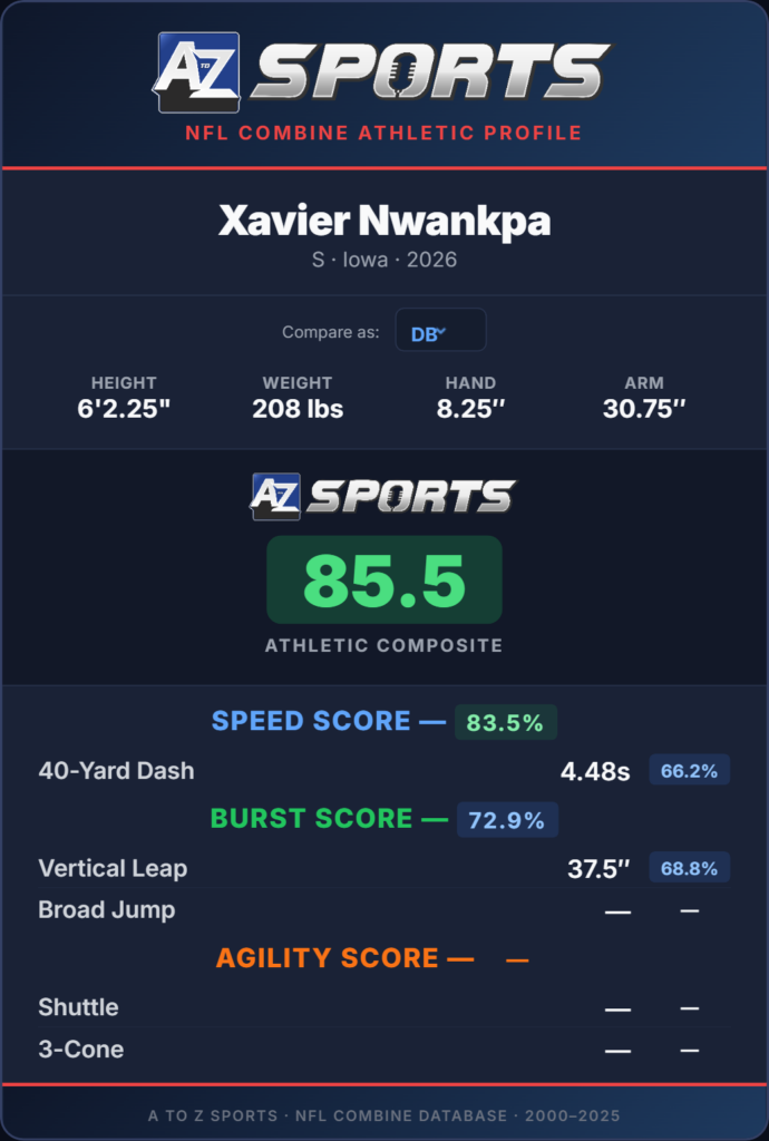 At the 2026 NFL Scouting Combine, Nwankpa put up a solid performance. He participated in the 40-yard dash and the vertical jump, earning an 85.5 A to Z Sports Athletic Composite ranking.