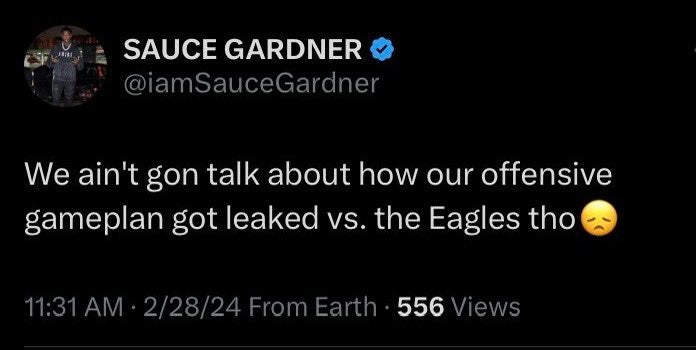 "We ain't gon talk about how our offensive gameplan got leaked vs. the Eagles tho," Gardner tweeted.