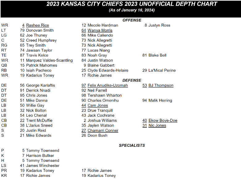 The Kansas City Chiefs have released an updated version of their depth chart ahead of the divisional round of the playoffs as they get set to travel to Orchard Park, New York to face the Buffalo Bills at Highmark Stadium.