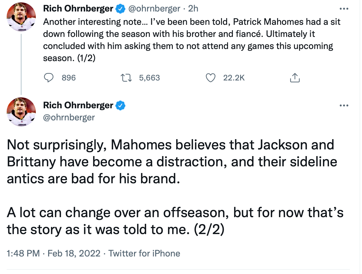 On Friday afternoon, verified Twitter user Rich Ohrnberger, who is a former NFL player, "reported" that Kansas City Chiefs quarterback Patrick Mahomes had a sitdown with his fiancé Brittany Matthews and his brother Jackson Mahomes and told them not to come to any games in 2022.
