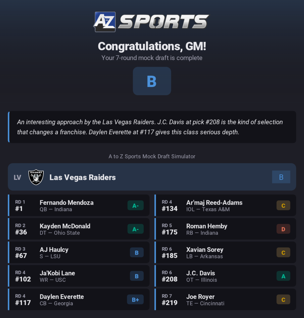 A to Z Sports has launched its brand new mock draft simulator, and we’re celebrating with a new 7-round Raiders mock draft.