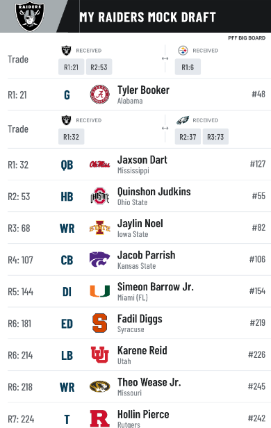 Yes, yet another trade. I truly feel like the Raiders will make a few trades in this draft. In this case, they get rid of their second round pick just to jump the Tennessee Titans, Cleveland Browns, and other teams in the beginning of the second round that need a QB, who may not even get a QB in the first round. And, if Dart is there at the beginning of the second round, he won't make it to the Raiders at No. 37. This allows the Raiders to get their QB, but not spend a high pick on him, while still keeping some draft capital.