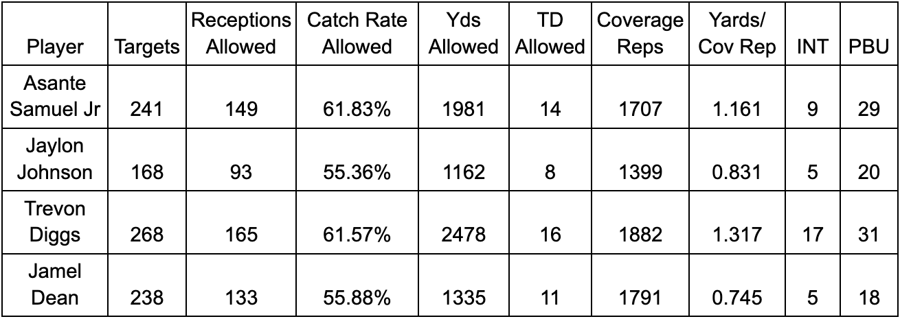 The player that immediately jumps out from these stats as a close comparable to Samuel Jr. is Trevon Diggs. Diggs became a household name in his own right – not just because he’s kin to the prolific receiver Stefon – but because his own ball-hawking ability produced a league-high 11 interceptions in 2021. Diggs is not to be mistaken with a cornerback of Jaylon Johnson’s ability, as Diggs thrives in a boom-or-bust play style. Of the four cornerbacks, he has nearly five hundred more yards allowed than the next highest cornerback, considerably more yards allowed per coverage rep, and double Johnson’s touchdowns allowed. However, Diggs causes turnovers, which is very clearly what the Cowboys paid for when they extended him.