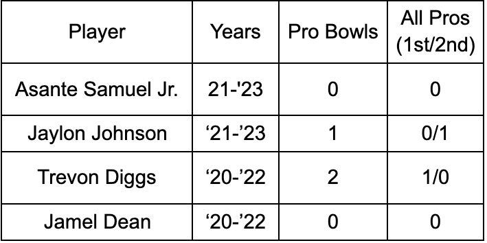 The only depth left on the roster, with in-game experience, comes from Deane Leonard and Ja’Sir Taylor, two late round picks from the 2023 draft that have been special teams standouts but inconsistent defensive contributors. Although both have shown flashes of promise, it’s Asante Samuel Jr.’s presence that allows the Chargers to remain somewhat patient and flexible as to how they approach upgrading the position.
