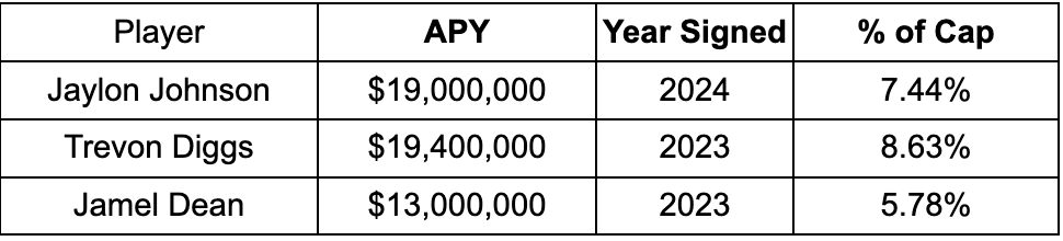 When comparing Diggs' and Johnson’s deals, it’s important to add the context that Diggs accepted a contract that will take him through his age-30 season. Although Jaylon’s deal was for a little less in cash and cap-share, he will have the opportunity to negotiate his next deal while he’s 29, as opposed to 31.