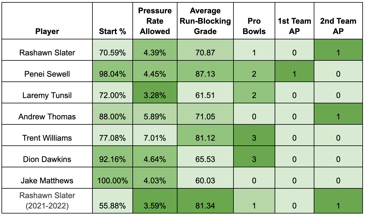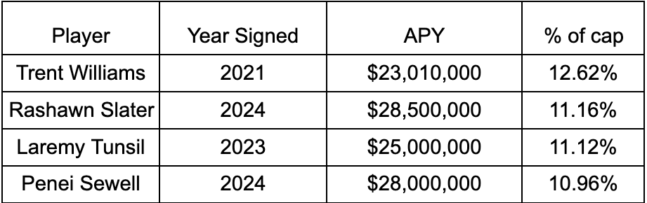 Wirfs is currently “holding-in” for a new contract, so there is certainly pressure for Joe Hortiz to lock up Rashawn Slater to a new deal before Wirfs drives the market even higher than Sewell’s $28 million APY. But where should a contract fall for Slater if they negotiate now? Even with his “down” 2023, where does he rank against his contemporaries?