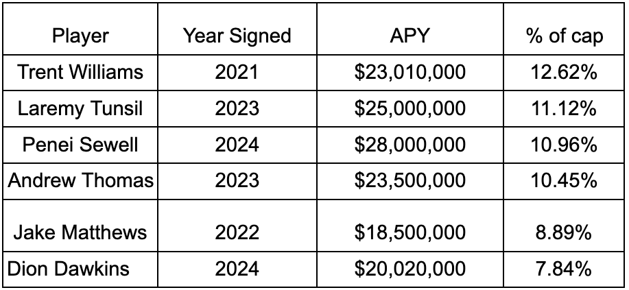 This would revise the cap-share leaderboard as shown below. Slater’s number still fits comfortably under Trent Williams’, giving Wirfs room to negotiate into the $30 million range while still not commanding the new cap-share lead.