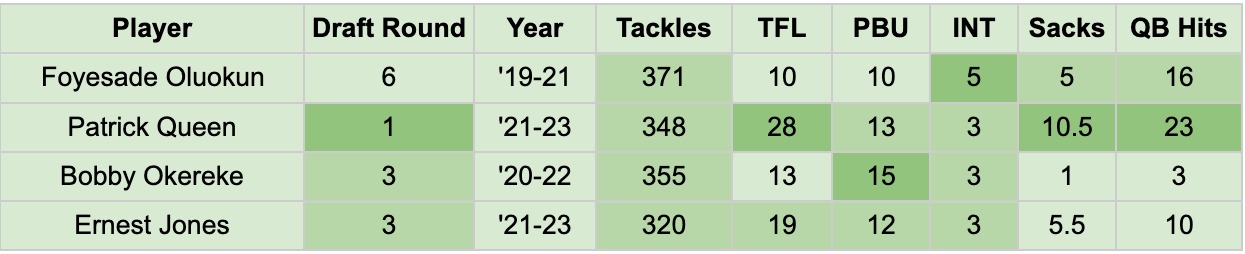 Looking at the three seasons before each of these linebackers signed their extensions, Jones fits in comfortably within the brackets of these comparables. His counting stats suggest he doesn’t get in the backfield as much as Patrick Queen, and is slightly lagging Foyesade Oluokun and Bobby Okereke in coverage and in combined tackles.