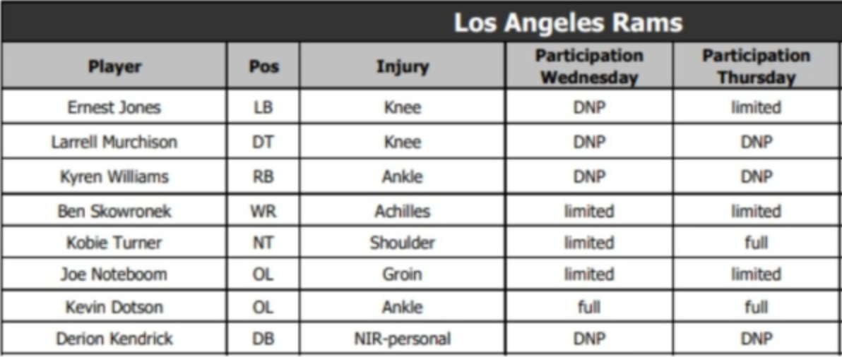 The rest of L.A.'s injury report remains the same. Defensive tackle Larrell Murchison (knee), running back Kyren Williams (ankle), and Derion Kendrick (personal) continued to not practice.