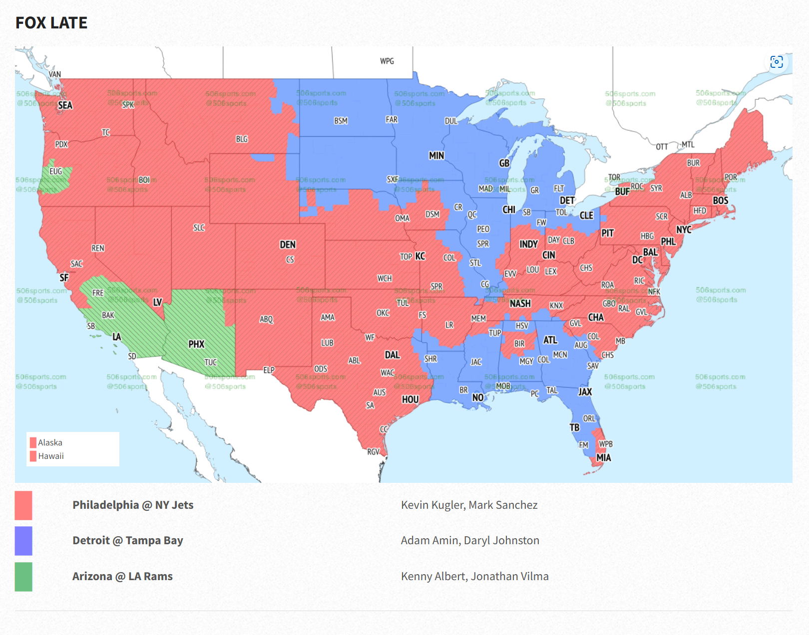 Meanwhile, Detroit and Tampa Bay will take over large parts of the Midwest, North, and Southeast viewing markets.