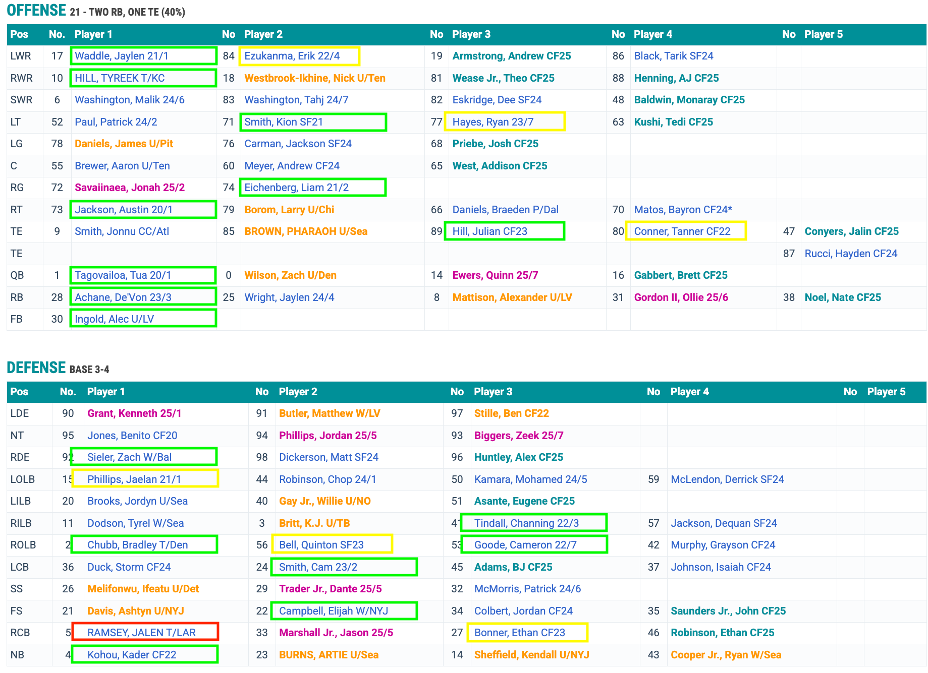 A grand total of 23 holdovers who were playing during Elliott's alleged "soft" collapse are still around. One such player, cornerback Jalen Ramsey, is actively on the trade block and not expected to return. Six additional holdovers (in yellow) were not on the active roster starting on December 1st due to either injury or serving on the practice squad. Just 16 members of the 53 man roster entering December of 2023 remain on Miami's 90-man offseason roster today. That's only 30% of the 53-man. Several of those players, including Cameron Goode and Channing Tindall, are long shots to make the roster in 2025.