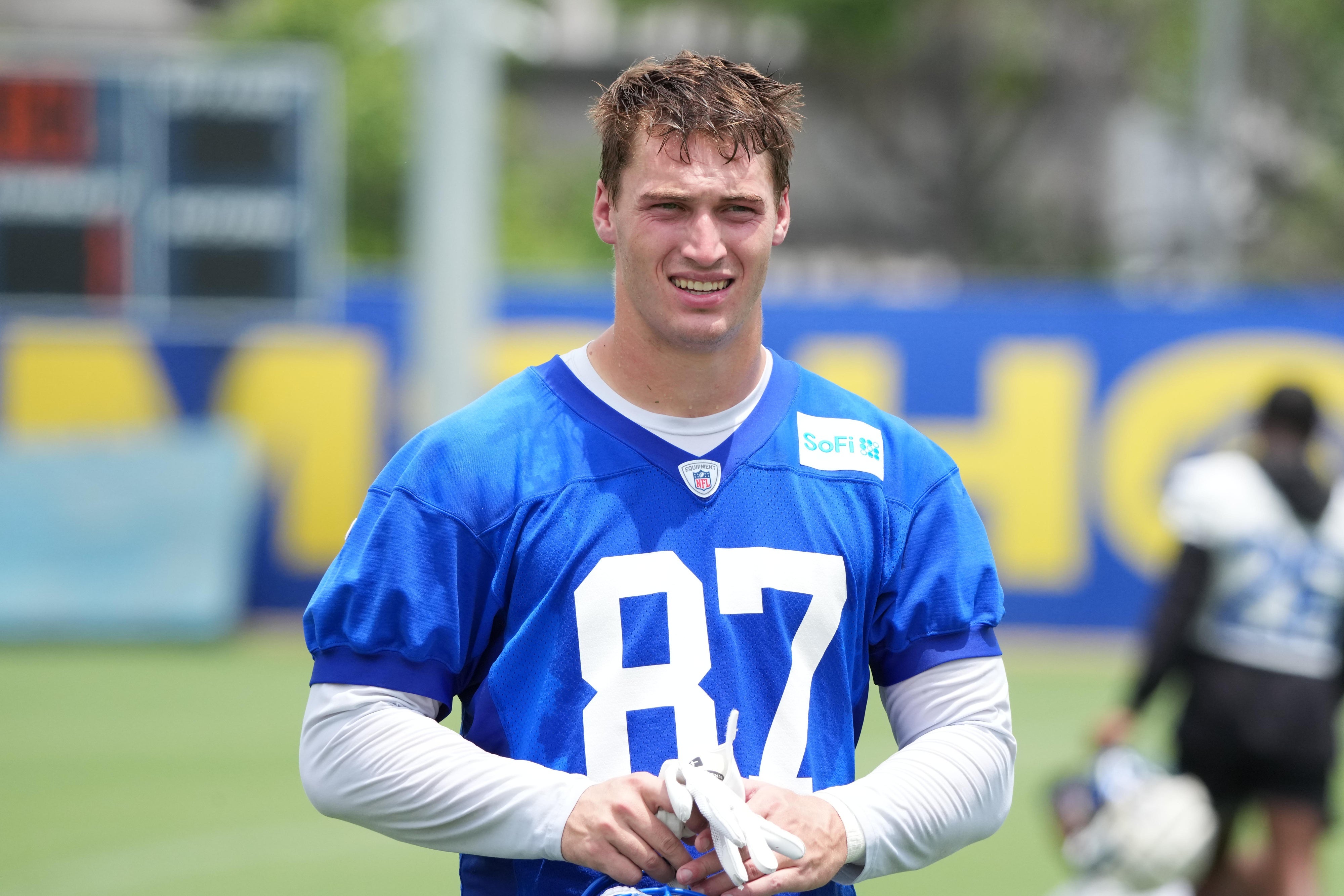 Jun 3, 2025; Woodland Hills, CA, USA; Los Angeles Rams tight end Davis Allen (87) during organized team activities at Rams Practice Facility. Kirby Lee-Imagn Images