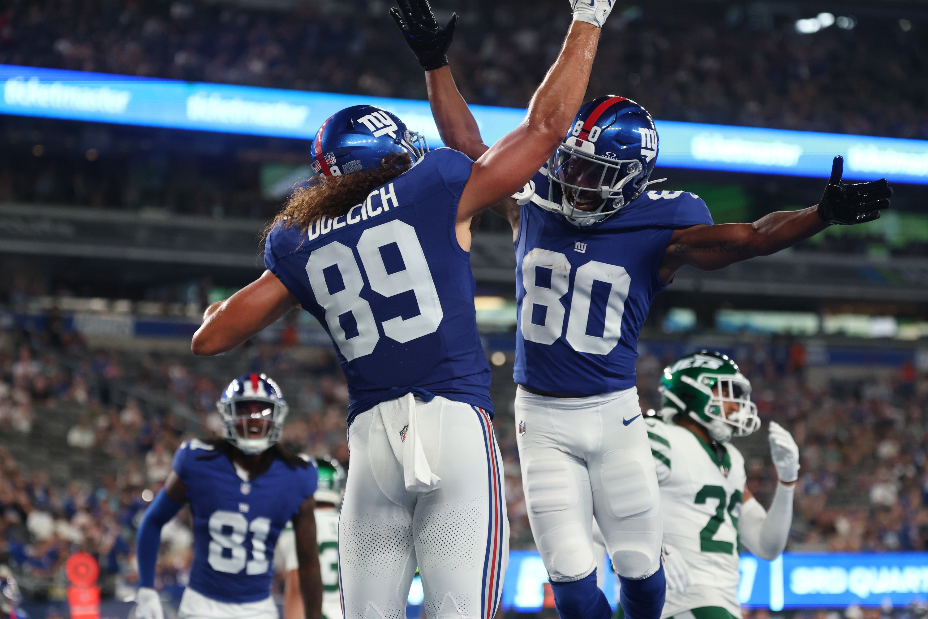 Aug 16, 2025; East Rutherford, New Jersey, USA; New York Giants tight end Greg Dulcich (89) celebrates a touchdown reception during the second half with wide receiver Montrell Washington (80) against the New York Jets at MetLife Stadium. Vincent Carchietta-Imagn Images