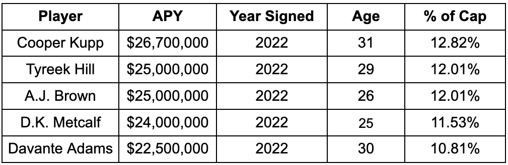 Given the context of these two contracts, the top of the receiver market is better reflected as follows (note: this is prior to AJ Brown's extension he signed with the Eagles):
