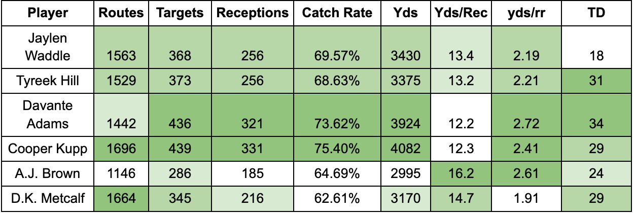 Of the receiver market-setters, here is how the three years of stats preceding their deals compare against Waddle’s first three years of his career: