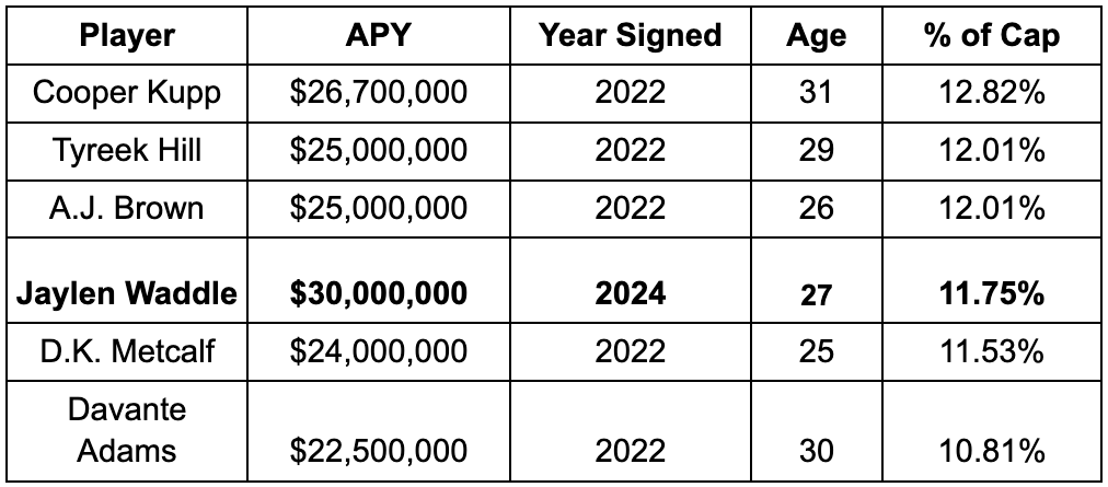 Extending Waddle at a $30 million APY should be considered palatable for all sides, as he matches the “optics” of Tyreek’s formal deal, and is also a lower cap share than Tyreek’s actual APY of $25 million at the time he signed it.