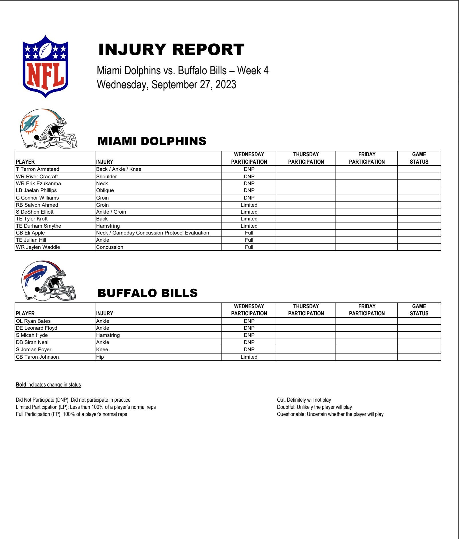 First Miami Dolphins injury update for Week 4 vs. Buffalo Bills